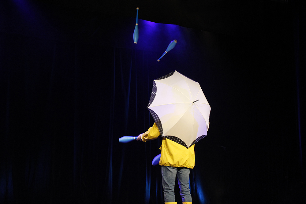 Caché sous son parapluie il attend une éclaircie pour retourner jouer, jusqu’à ce que la pluie ne revienne.